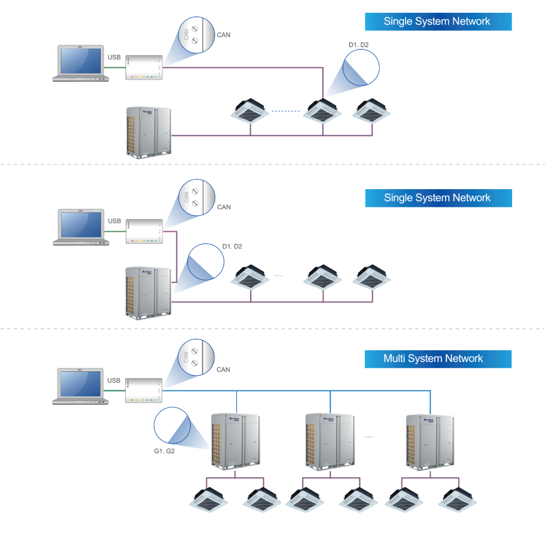 Users can use a USB data converter to convert freely CAN/HBS/RS485 data into USB data, achieving data interchange between computer and air conditioner.